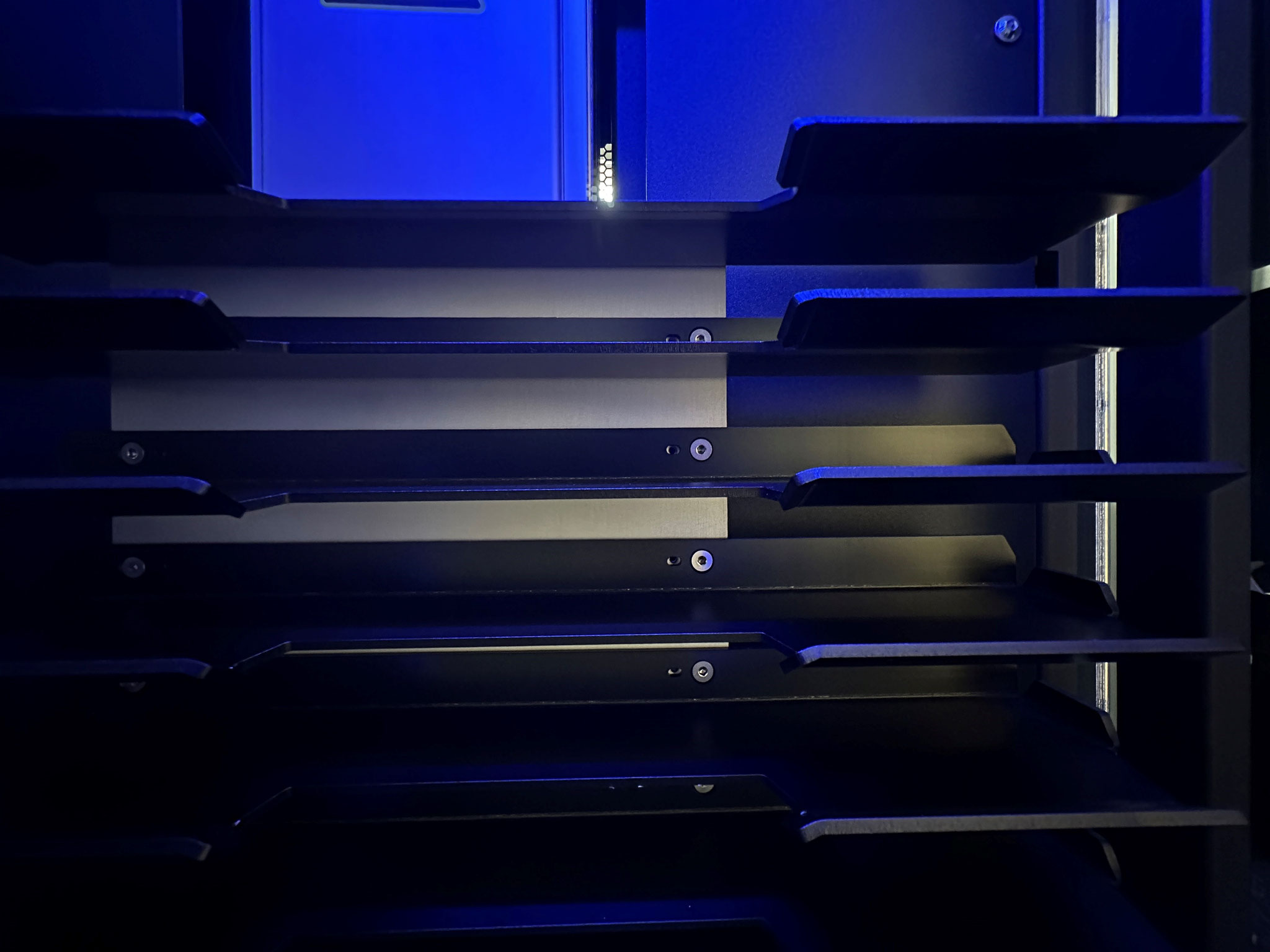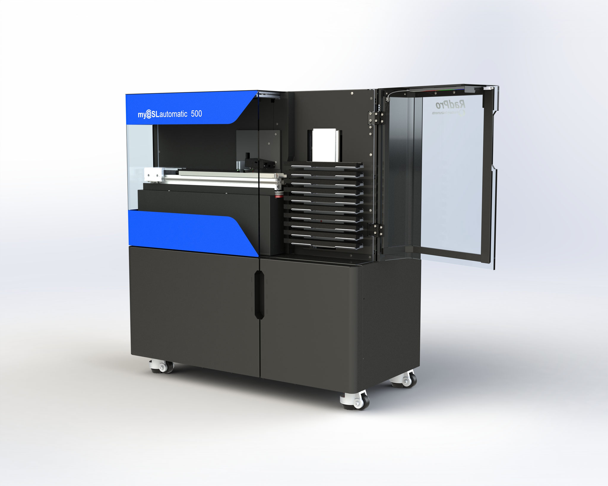 The myOSL 4000 can be equipped with up to two myOSLraser 4.0 readers, enabling parallel processing for maximum speed and efficiency. For calibration purposes, one of the reader units can be temporarily replaced by the myOSLirradiator 4.0, allowing for automated calibration of OSL dosimeters within the same cabinet—ideal for professional dosimetry services and laboratories.